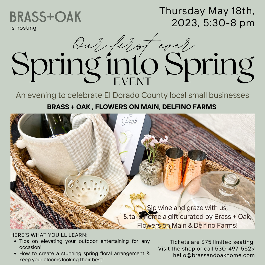 You’ll graze with us, sip wine, & take home a curated gift from Brass + Oak and Flowers on Main!! Very limited seating available, get your tickets today by calling the store at (530) 497-5529 or visiting www.brassandoakhome.com/shop to purchase online!! Or pop by this weekend and purchase here at the shop! GRAB YOUR TICKETS BEFORE THEY’RE GONE!!